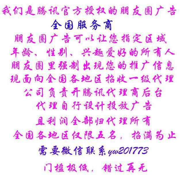 腾讯社交广告全国代理招募,公司负责开腾讯服务商后台,代理自行设计投放广告,且利润全部归代理所有。各地区仅限前五名,招满为止,需要联系微信yw201773,电话*****6517门槛极低,错过再无。