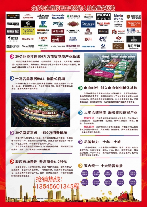 3月24号邀您与一马名品家居馆来个约会!商机财富免费咨询豪礼免费领!金猪拱门遇良机,财运享通临一马!县政府和一马集团重点打造的崇阳一马建材城名品家居馆3月24号正式营业!十年包租精致装修绝佳位置全城疯抢的黄金旺铺你值得拥有!崇阳一马邀您商机财富共享,轻松当大品牌的房东!抢铺热线:*****1345程
