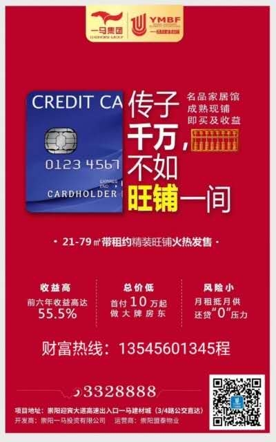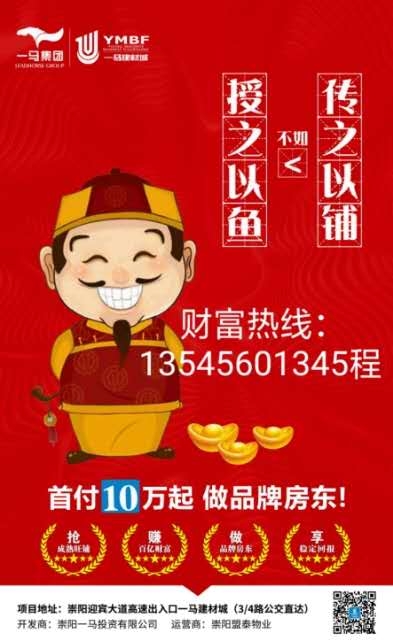 临街门面,大牌入驻,十年包租,精致装修,无忧托管,升值巨大。崇阳一马邀您财富商机共享,轻松当大品牌的房东!一马旺铺解百愁,投资创业两不误;升值发财均兼顾,早买早赚早享福。