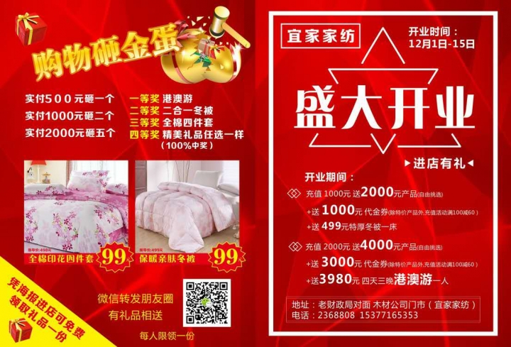 为庆祝通山县宜家家纺盛大开业,现活动预存 99 元 价值498元全棉印花四件套 免费送 ,需本人到店领取。活动细则加店主微信!