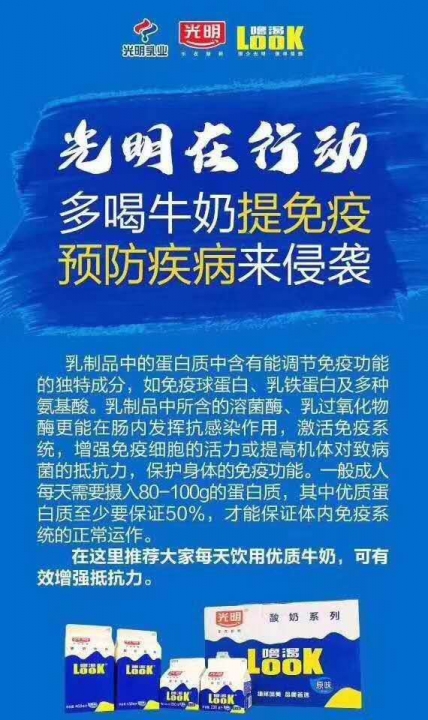 光明酸奶为响应国家号召,疫情期间多饮用酸奶增强自身免疫力。