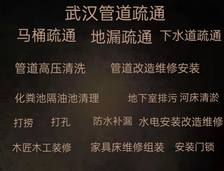 1、管道疏通:大中小机械疏通各种疑难下水道、卫生间、地漏、浴缸、菜池、阴沟、马桶、蹲坑等。